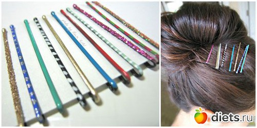 заколки-невидимки для волос. Могут получиться очень интересные решения! Только учтите, что лак должен просохнуть хотя бы сутки. Сверху цветной лак можно закрепить финишем-глиттером или просто прозрачным защитным слоем – тогда цветное покрытие прослужит дольше.
