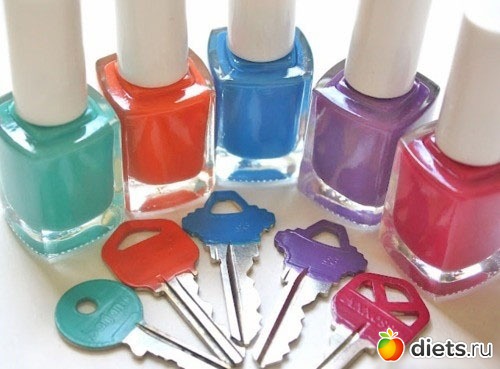 для маркировки ключей. Можно поставить точки лака: разный цвет будет обозначать разное назначение – ключ от дачи, ключ от квартиры, ключ от офиса. А можно полностью покрыть цветными лаками «головки» ключей.