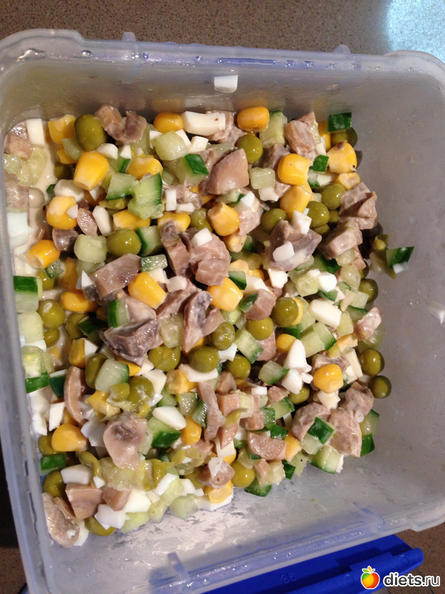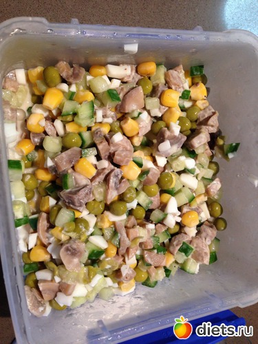 добавляем кукурузу, горошек, заправлем все натуральный йогуртом ( легким майонезом, сметаной на ваше усмотрение). Получается вкусненький и сытный салатик. Сегодня довольствовалась им на ужин.