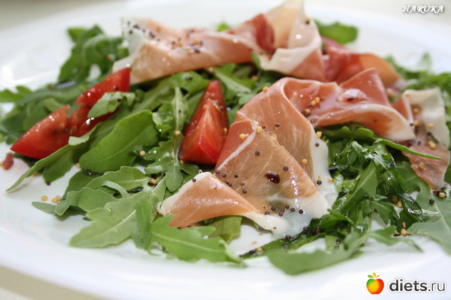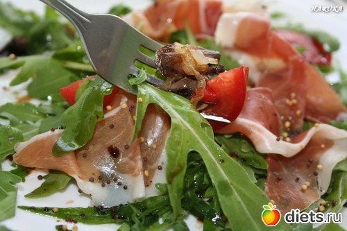 Салат подается порционно: выкладываем на блюдо обжаренные грибы с луком, сверху укладываем салат- руккола, помидорки и хамон.