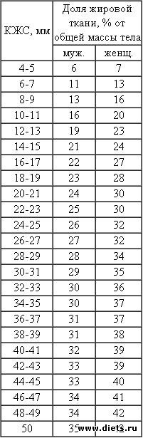 На здоровье влияет не масса тела сама по себе, а доля в ней жировой ткани. Содержание ее в организме можно определить по толщине кожно-жировой складки. Ее измеряют с помощью специального циркуля - калипера, который сжимает ткани со строго определенной силой. Измерения проводят в четырех точках: над трехглавой мышцей плеча, над двуглавой мышцей плеча, под углом лопатки и над гребнем подвздошной кости (у пупка) — и вычисляют среднее значение полученных величин. Содержание жировой ткани в теле взрослых людей можно определить по табл. 2.