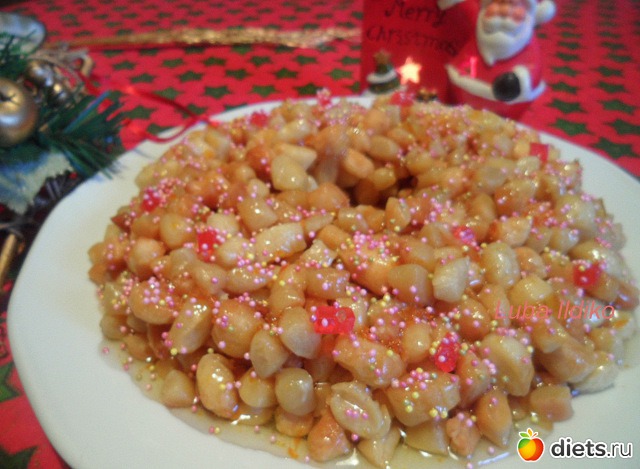 Украсить можно: цукатами из засахаренных фруктов и ягод (апельсина, тыквы, вишни и др). Также - орешками и современными цветными посыпками. Однако, самая важная деталь - цукаты из знаменитой тыквы - "cucuzzata "(если я правильно перевела, конечно), которые можно найти только в Неаполе. Если вам удастся их найти, то ваши struffoli будут, действительно, совершенны.