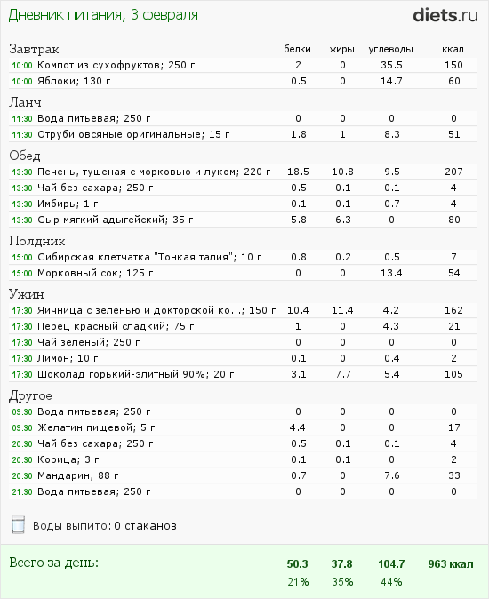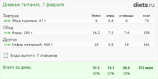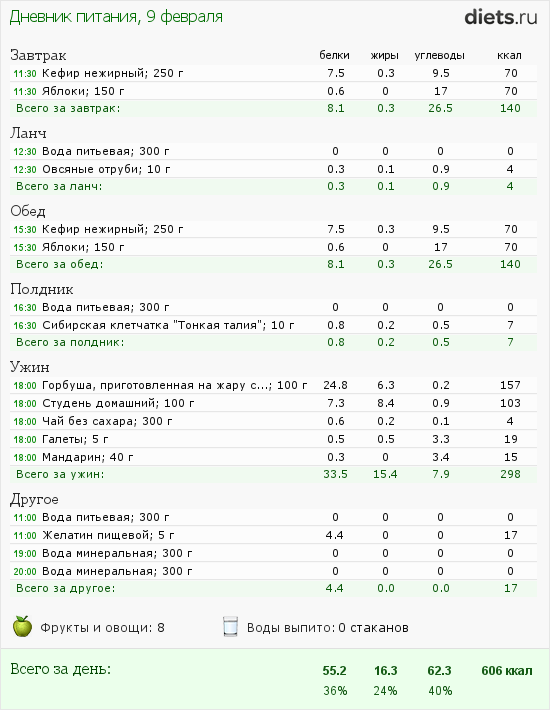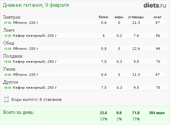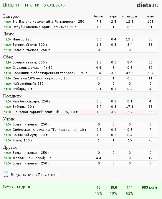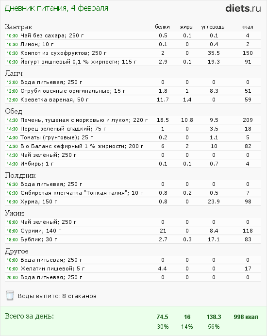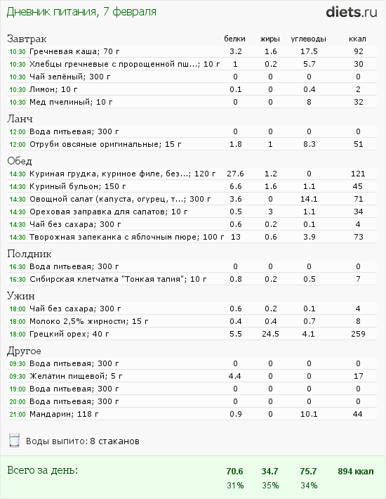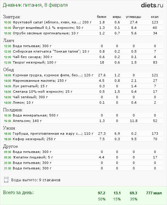 Анна добрый вечер! вот мое меню за сегодня... в два раза меьше чем вчера по каллорийности. плюс отшагала аж 10000 шагов!!!! пока дочка гуляла я ходила считала и записывала. уфффф. из спорта комплекс упражнений на пресс 30 минут и обруч 50 минут ( 2 раза по 25 минут)