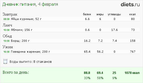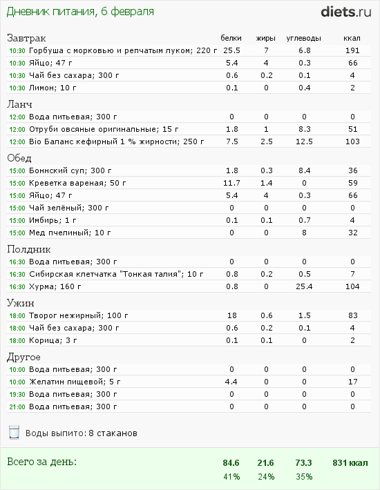 Я сегодня постаралась исправиться) Сделала завтрак более сытным, ты оказалась очень права! Я весь день чувствую себя сытой и к вечеру вообще ничего не хочу есть! "Завтракаю - как королева. Обедаю - как принцесса. Ужинаю - как нищая...." Что-то в этом есть. Знаешь, я хочу выработать новое правильное пищевое поведение, а не быть рабой желудка Спасибо, ты натолкнула меня на правильный путь) Посмотри, пожалуйста, мой сегодняшний отчет по питанию - оцени? Готова выслушать любое мнение!