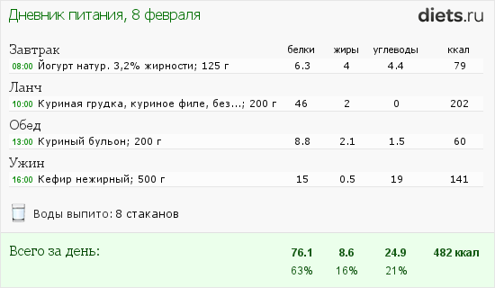 АННА добрый день!!!!!!!! уф настроение не айс с одной стороны с другой лучше. на улице уже весна!!!!!!!! все такет бррррр дочка уже практически здорова но пока результаты анализов не получу в школу не поведу. сегодня набрала заданий ей на всю неделю. сегодня съела мало но по каллорийности многовато.. объясняю отключили воду и гречу сварить не смогла((( пришлось есть одно мяско. ну ичего гречку завтра отварю и с кефирчиком мини разгруз будет
