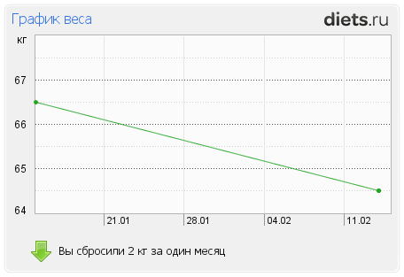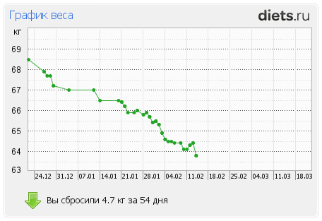 всем доброго времени суток))) прошли праздники... ПМС и КД... теперь я схватила себя за голову... вес немного ушел после праздников на во время КД остановился на одной отметке. 66.5. теперь буду пробовать эту диету. надеюсь все получится. надо к лету убрать 11 кг