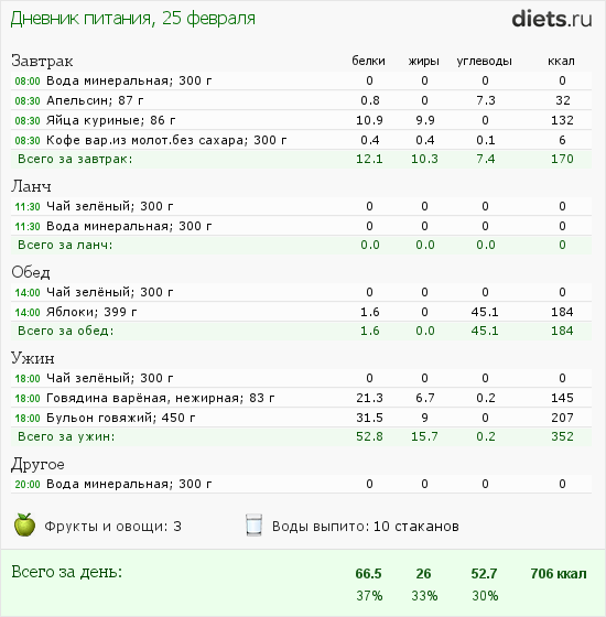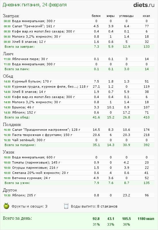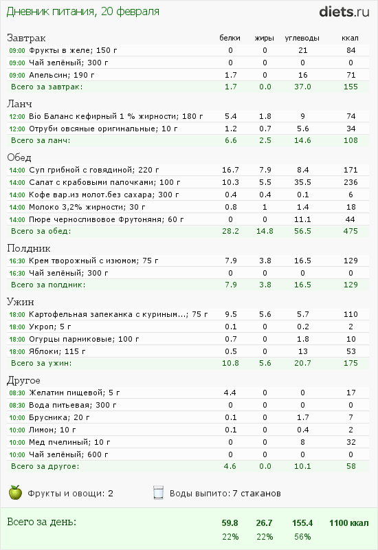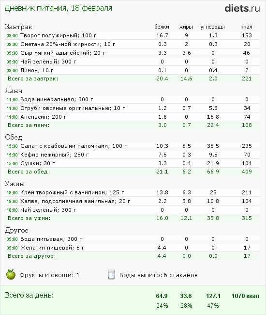 ох привет Анечка. вчера меня не было весь день на сайте. с утра с дочкой сели играть в монополию и всё... чуть на вокал не опоздали. что то у меня аппетит спрятался. со вторника еле 300 калл набираю. ну понятное дело простывшая нос не дышит вот и не чую ароматов летающих на кухне. сегодня даже безе позволила себе.. но обо всем по порядку. вот мое меню за вчера. всё записала ничего не упустила