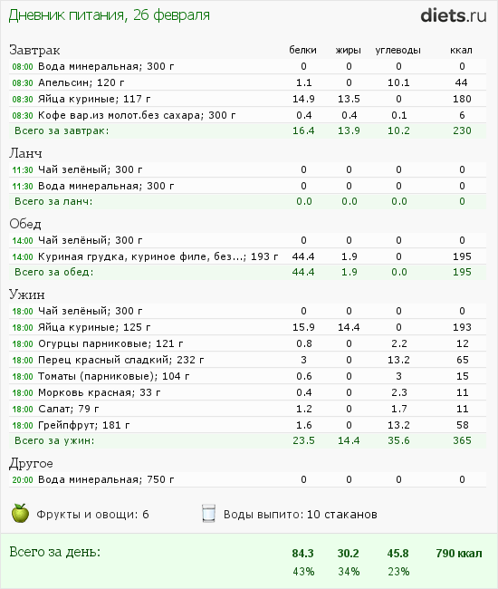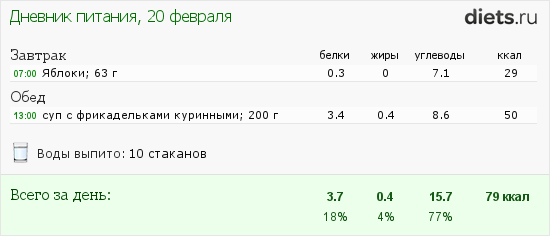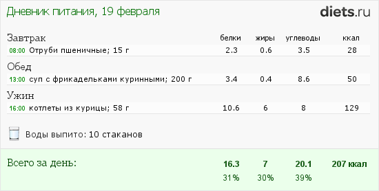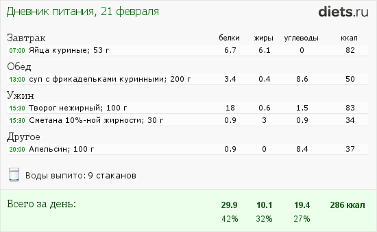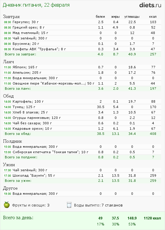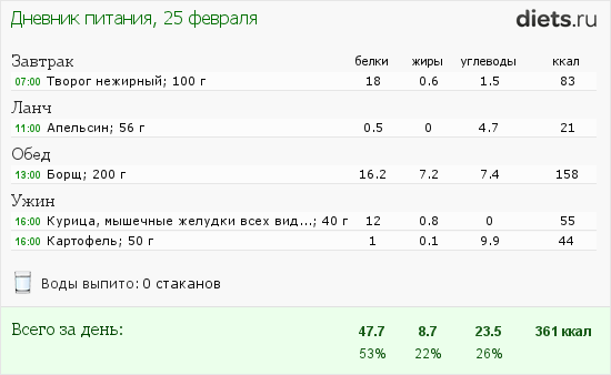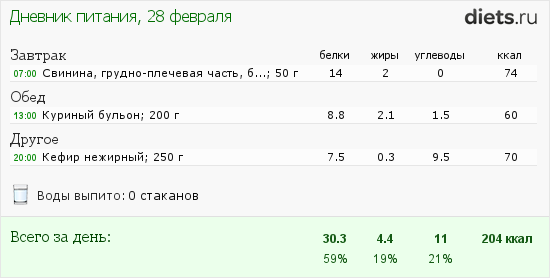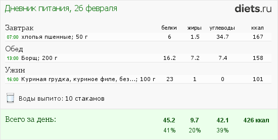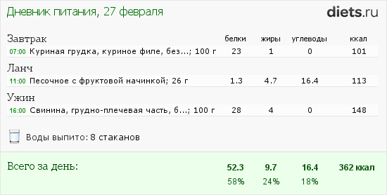немного ((( ну что поделать зато воду пью как слон на водопое. из активности аж 40 минут обруча. подруджка подсадила на сериал сверхъестественное. смотреть начала с 1 серии 1 сезона. а всего 8 сезонов. вчера 2 серии посмотрела и во время 1 даже обруч крутила. плюс упражнения бразильская попка. вижу результат уже. животик подтягивается. поэтому решила сегодня сделать чисто мясной день. отварная грудка на завтрак и жаренная свининка на ужин. и всё. даже без обеда. не хотелось есть. но один косяк был съела маминого пирога из песочного теста с брусникой. но решила что чуть чуть можно. ))) и получается это всё вот так
