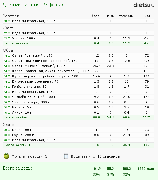Доброе утро Анечка!!! Поздравляю твоих любимых Мужчин с праздником. счастья здоровья и благополучия!!! Как твое здоровье? я уже получше нос задышал но вкус еды так и не ощущаю. с одной стороны это плюс ведь не разжигается аппетит ароматами. а с другой минус. отцу подарили парфюм соседи а я не могу оценить его аромат((( а я так тащусь п мужским ароматам. эх ничего понюхаю его когда нас полностью задышит. сегодня я своих домочадцев порадовала салатиками и тортиком. а ан вечер им сделаю макарошки под курочкой. думаю даеж в конкурс этот рецепт выложить. ведь он простой хоть и не сильно диетический. вот. так вот мое меню на сегодня. не удержалась и решила что ан ужин съем салатика лучше чем макарон с курицей. вот мой план питания.