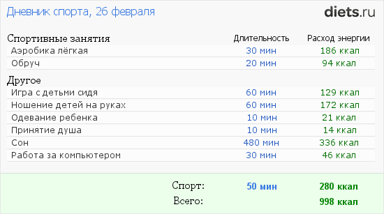Из активности: 20 минут - зарядка, быстрая ходьба - 75 минут, обруч - 5 минут.