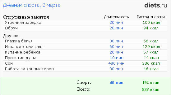 Из спорта: 20-минутная утренняя зарядка с Ольгой Новиковой, обруч - полчаса, пресс и косые линии живота по 100 раз