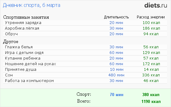 Из активности: утренняя зарядка с Мишуткой 15 минут, 30 минут легкой аэробики, по 100 раз пресс и косые линии живота, обруч - 15 минут. Ну прогулку в 1 час не считаю, это так - воздухом подышать