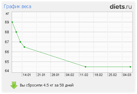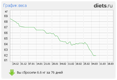 всем доброго времени суток))) прошли праздники... ПМС и КД... теперь я схватила себя за голову... вес немного ушел после праздников на во время КД остановился на одной отметке. 66.5. теперь буду пробовать эту диету. надеюсь все получится. надо к лету убрать 11 кг