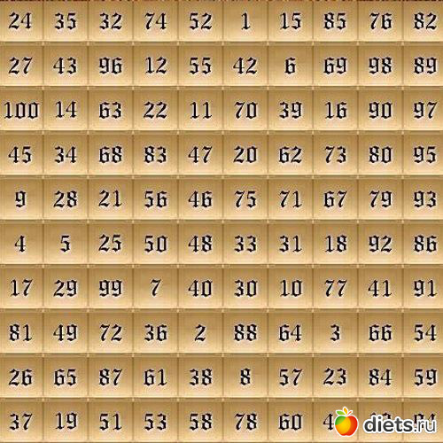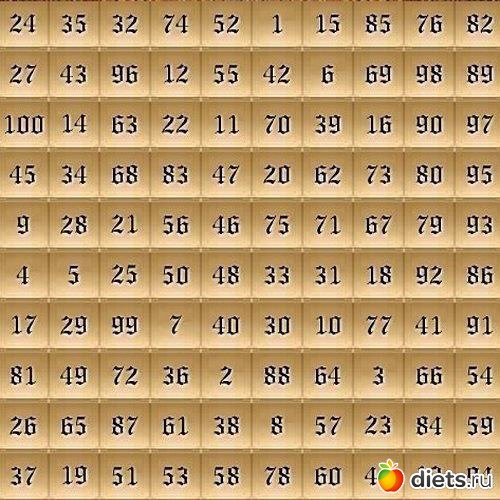 Загадав желание, ткните пальцем наугад в таблицу, состоящую из чисел от 1 до 100. В какое число попали пальцем – таков и ответ.