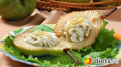 Груши разрезают пополам, удаляют часть мякоти и сбрызгивают лимонным соком. Наполняют половинки груш творогом, смешанным с измельченной мякотью груш и мёдом. Выкладывают на листья зелёного салата и подают. Читать полностью