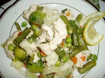Треть пакета овощей в заморозке (горошек, цветная капуста, фасоль спаржевая, брюссельская капуста, морковь)