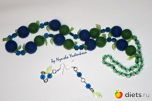 А это набор из бус и сережек, шерсть насыщенных цветов(синего и зеленого), промежуточные бусины в виде синих цветочков и нежно-зеленых листков, смотрится очень красиво и свежо))