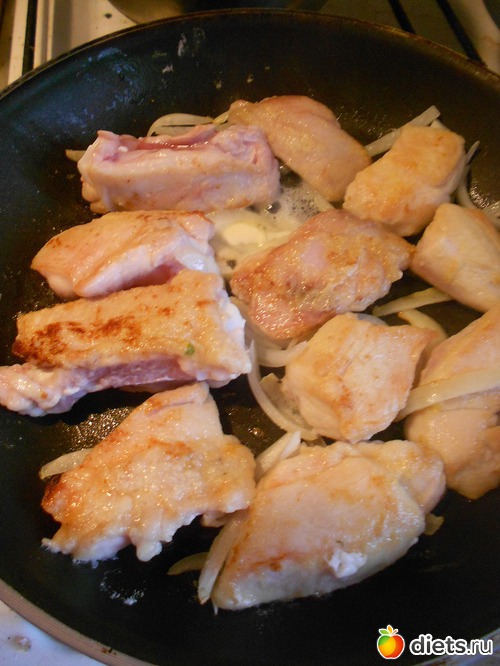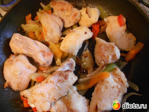 1. Курицу режем небольшими кусочками, слегка обваливаем в муке (у меня ушла 1 ст. л. без верха, мука делает консистенцию соуса приятной), чуть-чуть обжариваем на смеси масел, в процессе добавляем лук и сладкий перец.