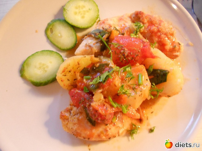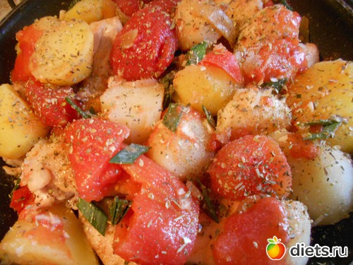 У меня было: 2 куриных бедра без кожи, 1 грудка, 5 небольших картофелин, 1 луковица, банка помидоров в собственном соку, замороженный болгарский перец (горстка), чеснок (1 крупный зубчик), прованские травы, 1 ст.л. оливкового масла и 2 ч.л. масла сливочного, соль, перец из мельнички.