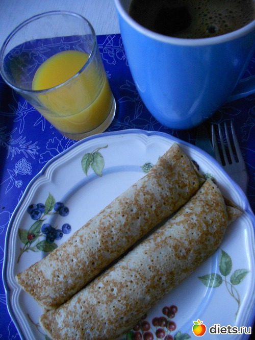 Завтрак - опять блинчики с творогом, сок апельсиновый и кофе, на этот раз фото аутентичное (вот я какие умные слова знаю):