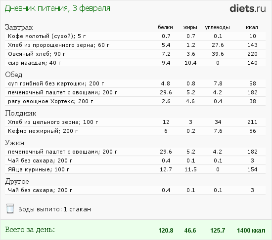 Белки -120.8 г Жиры -46.6 г Углеводы -125.7 г Всего за день: 1400 ккал
