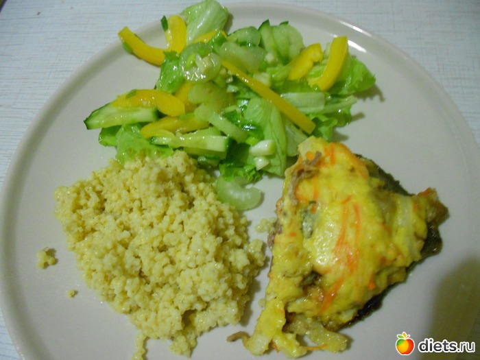 А вот и наш ужин - печень с грибами и перцем под сыром, пшено и салатик: