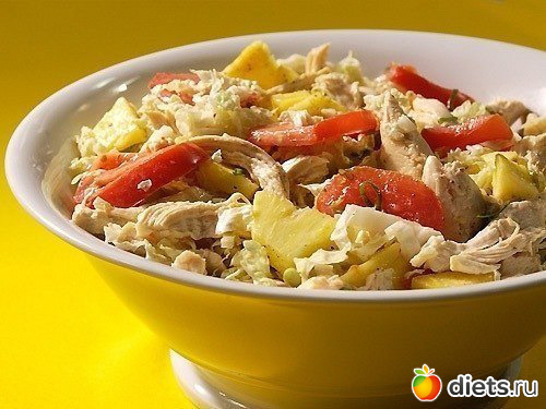 В средней миске смешайте горчицу, оливковое масло, сок лайма (лимона). В салатнице смешайте порезанное кусочками куриное мясо, порезанную полосками пекинскую капусту, помидоры и мелконарубленный зеленый лук. Перед самой подачей к столу добавьте в салат смесь с курицей и кусочки ананаса, посолите, поперчите.