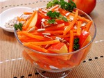 морковь, яблоко, грецкий орех, я еще добавила кураги, можно еще изюма, заправила виноградный маслом, можно оливковым