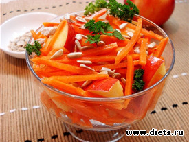 салат из моркови с яблоком морковь, яблоко, грецкий орех, я еще добавила кураги, можно еще изюма, заправила виноградный маслом, можно оливковым