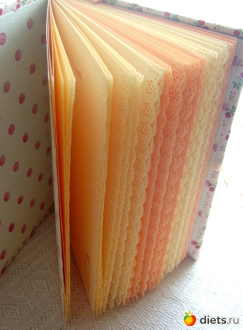 Однажды я уже делала такой блокнотик, только он был маленьким, этот же большой - форматом А5 - много войдет рецептов! А еще там разноцветные странички - нежно персикового цвета и бежевого! 80 листов (160 страниц) каждый листочек по краю обработан фигурным дыроколом, что создает такой красивый и нежный эффект кружева. Каждый листочек так же проштампован... Читать полностью
