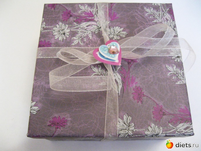 Набор упакован в плотную картонную коробочку, перевязан шифоновой лентой.