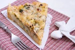 Достать тесто, выложить в форму, разровнять, сформировать бортика. Выложить картошку, грибы, чеснок, зелень - аккуратно перемешать. Залить сливками. Посыпать тёртым сыром.