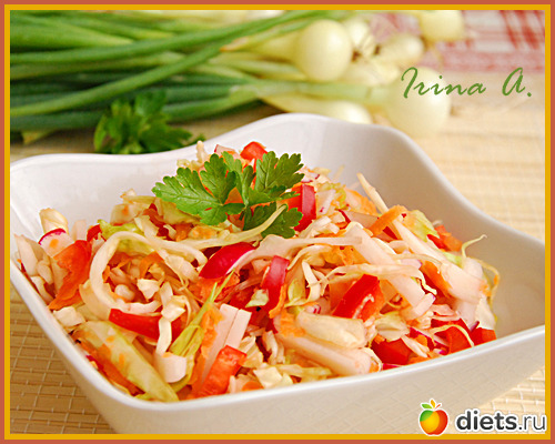 Капусту белокачанную нашинковать(если не молодая, то подсолить и "пожмыхать" ), редис нарезать брусочками, перчик тонкими полосками, морковку натереть на крупной терке и если есть желание, заправить йогуртом /творогом активия/, а можно и так похрумкать. Зелень добавлять по-настроению.