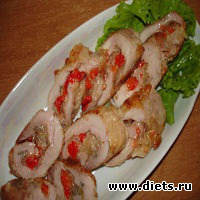 3. Уложить на отбитое филе начинку и свернуть рулетиками