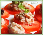 Помидор(можно не добавлять, тогда сока будет меньше), огурец, редис пропустить в блендере, подсолить, слить лишний сок из овощей, затем смешать с биойогуртом и уложить либо на дольки помидра, либо в "лодочку" огурца, либо в перчик. Сверху украсить молодым базиликом.