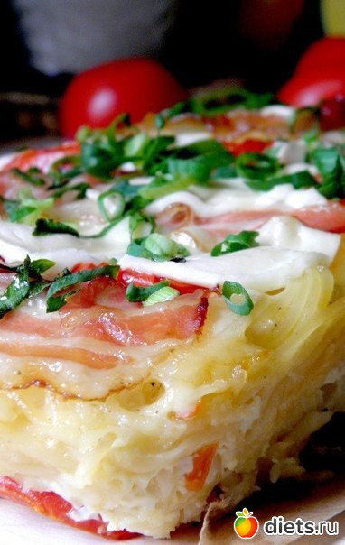 5. Оставшийся сыр нарезать пластинками или натереть на терке, зеленый лук нарезать и посыпать пирог. Убрать в духовку еще на 10мин. Я использовала сыр Сулугуни: прочитала, что он прекрасно плавится и им можно заменить сыр Моцарелла в пицце.