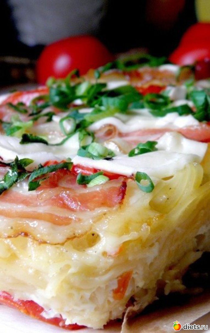 4. Сверху на будущий пирог выложить ломтики бекона и помидоры. Убрать в духовку, нагретую до 180С примерно на 30мин до момента, пока яичная смесь полностью схватится, а бекон станет аппетитно-золотистым.