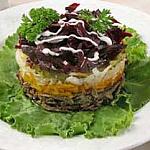 На тарелку выложить печень, половину майонеза, затем выложить свеклу и вторую половину майонеза.