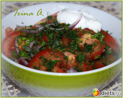 Помидоры нарезать дольками, красный сладкий лук полукольцами, укроп измельчить, зелёный лук тонко нарезать, подсолить, заправить активией творожной или чем-нибудь "протасовским" на Ваше усмотрение