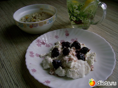 Завтрак: напиток(лимон+корица+мед-натощак)+овсяночка+творог с вишневым вареньем