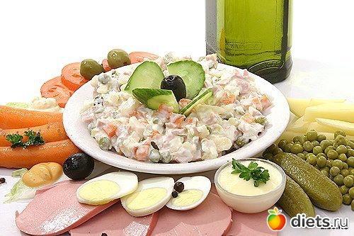 Знаменитый салат всех времен и народов, но чтобы он не принес значимого ущерба фигуре из него следует удалить картофель, желтки и саму селедку. Спросите почему? В праздники уровень соли в организме и так превышен, а чтобы название салата да и сам салат не потерял вкуса из-за отсутствия рыбы, замените селедку на консервированного тунца. А также обычный майонез на домашний. Итог экономия