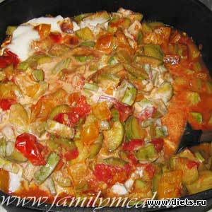 Сочные молодые кабачки в сочетании с томатами и болгарским перцем в сметанном соусе.