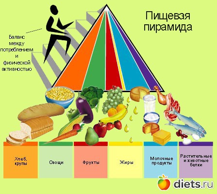 Итак, рисуем схему здорового питания. Давайте представим себе пирамиду, состоящую из разных секторов, где каждый сектор — группа питательных веществ. Это и будет пищевая пирамида или пирамида питания. Все группы питательных веществ в ней одинаково важны, ни без одного не может быть правильного питания. Только вот соотношение этих веществ разное. Чего-то больше, чего-то — совсем немного. Но немного — не значит не важно. Это и есть принцип здорового рациона: организм должен получить все, в чем он нуждается. Особенно это важно в случае лишнего веса: организм не отдаст лишний жир до тех пор, пока не привыкнет, что ему постоянно дают все необходимое.