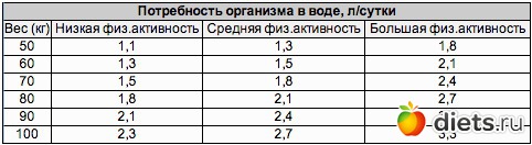 Ученые из института медицины Национальной Академии наук США установили: среднестатистическая женщина должна получать в среднем 2,7 литра (примерно 11 стаканов), а мужчина 3,7 литра (15 стаканов) всей жидкости в день. Ключевое слово здесь – «всей». 40% жидкости к нам приходит с едой, и получается, что взрослому человеку нужно в среднем выпивать 1.5-2 литров воды в день. Данная таблица поможет понять, сколько воды нужно потреблять с учетом массы тела и уровня физической активности.