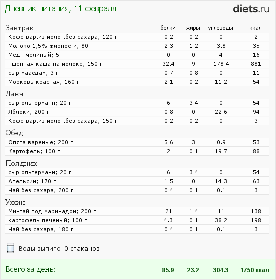 Всего за день: 1750 ккал Белки 85.9 г Жиры 23.2 г Углеводы 304.3 г