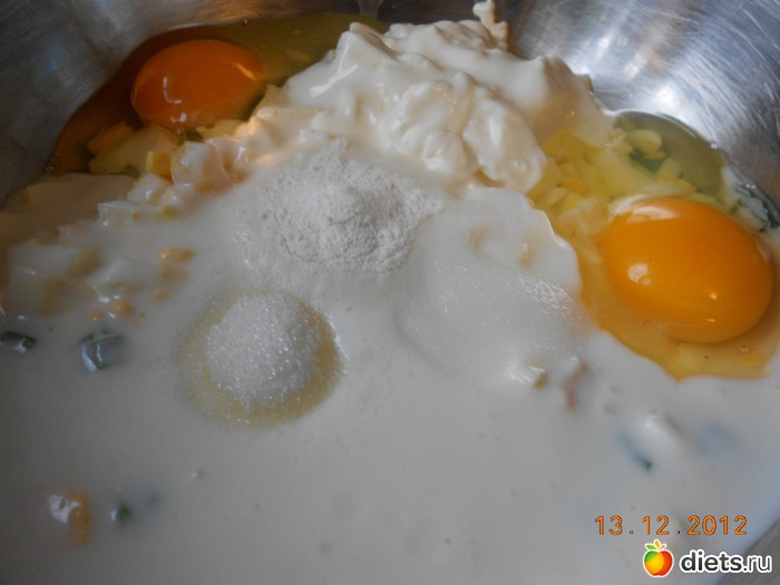 Смешиваем нарезанные яйца и лук, добавляем к ним кефир, сметану, сырые яйца, соль, разрыхлитель и щепотку сахара. Тщательно перемешиваем.