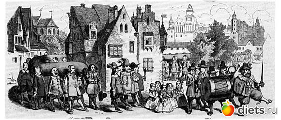 В этот же год на Крещение пекари взяли реванш. К постоялому двору мясников они принесли 8 огромных батонов с изюмом, в 5 локтей длиной каждый. Для их выпечки потребовалось 12 четвериков (1 четверик - куль в четыре пуда) пшеничной муки и 2 фунта аниса. Украшены батоны были коронами звездами и гербами из пряничного теста.