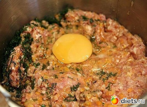 2. Обжаренные лук, морковку и грибы пропустить через мясорубку и добавить в куриный фарш. Так же в фарш добавить сырое яйцо, соль, перец и мелко нарезанный укроп. Смесь хорошо перемешать.