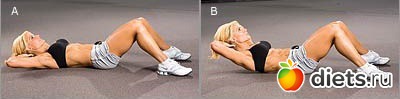 Плавно скручиваем корпус наверх (поднимаем его), отрывая от пола лопатки. При этом поясница остается плотно прижатой к полу, локти не сходятся, подбородок груди не касается.