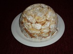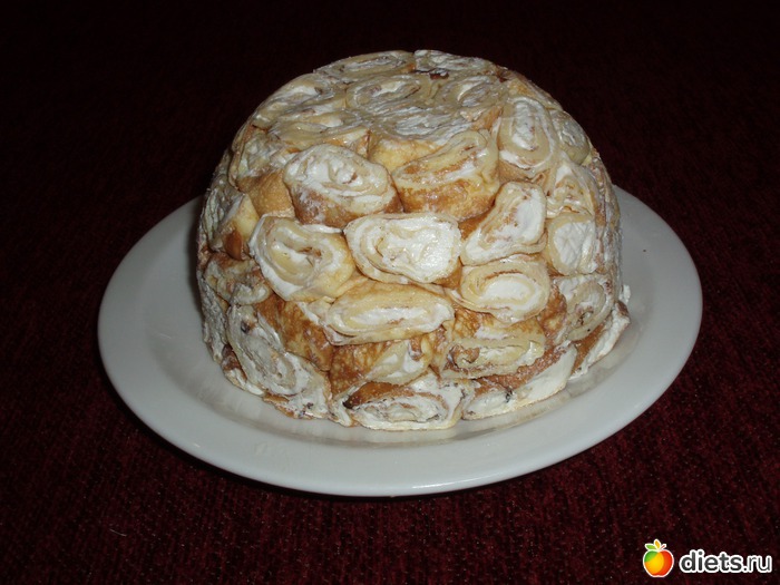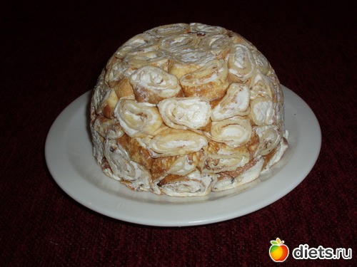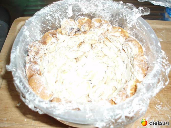 Перед подачей очень аккуратно подставляем блюдо, переворачиваем и потихоньку со всех сторон вытягиваем за пленку. Когда Шарлотка удачно приземлилась, снимаем целлофан и... вуаля-